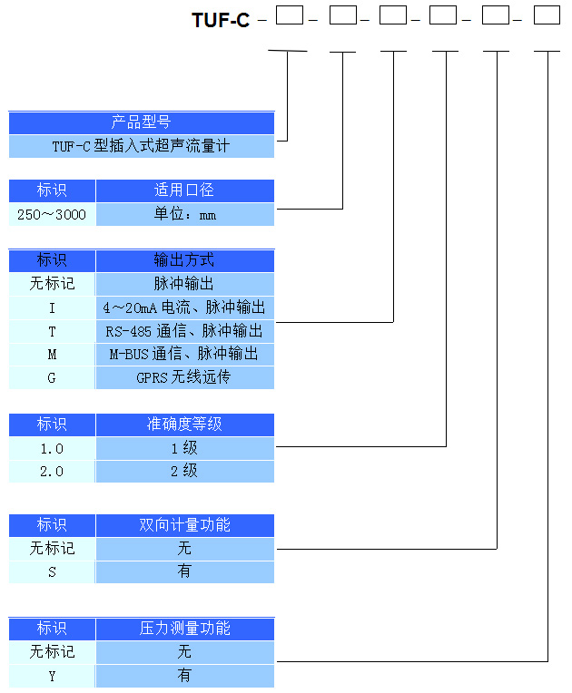 表示:TUF-C型插入式超聲流量計(jì),適用口徑:300mm,輸出方式:RS-485通信、脈沖輸出,準(zhǔn)確度等級(jí):2級(jí),雙向計(jì)量功能,帶壓力測(cè)量功能。
